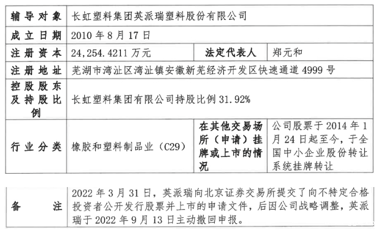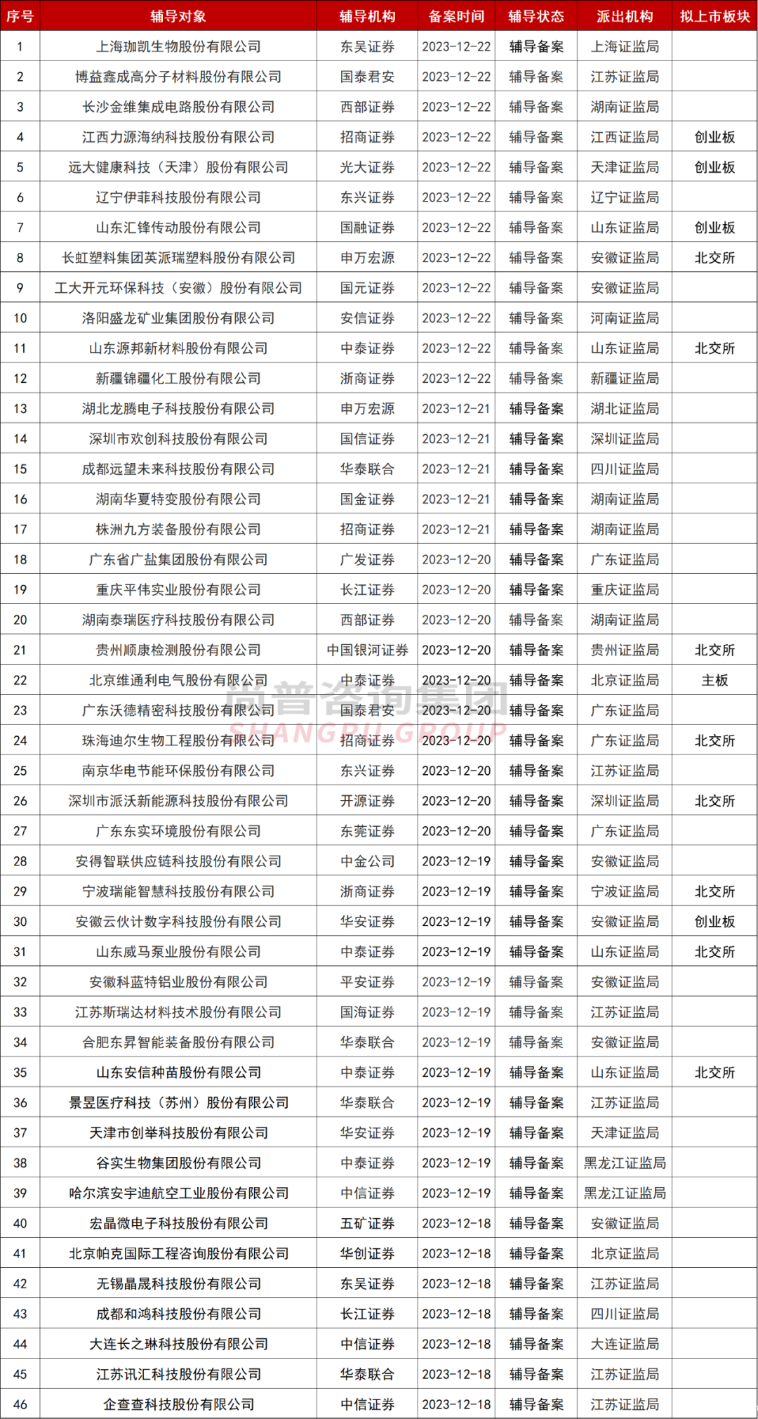 证监会官网显示截至发稿前,2023年12月18日-12月22日,启动辅导备案的企业共46家。 从辅导备案时间来看:18号7家,19号12家,20号10家,21号5家,21号12家。 从辅导备案企业的注册地来看:安徽、江苏各新增7家辅导备案企业;广东新增6家;湖南、山东各新增4家;北京、黑龙江等各新增2家;上海、河南等各新增1家。 从新增辅导项目量来看:中泰证券收获5家;华泰联合收获4家;招商证券、中信证券各收获3家;国泰君安、东吴证券、中兴证券等各收获2家;光大证券、中金公司等各收获1家。 以下是2023年12月18日-12月22日新增的IPO辅导备案企业名单:(注:如有未披露具体的申报板块,“拟上市板块”处为空。) 值得注意的是,本周有2家企业重启IPO!谷实生物、英派瑞前次IPO主动撤回后“卷土重来”。 谷实生物主营业务以饲料研发、生产及销售为核心,并以饲料业务为基础向产业链上下游拓展生猪养殖、销售及饲料原料贸易等业务。在饲料业务板块,公司饲料产品包括猪饲料、禽饲料、反刍饲料等主要畜禽饲料产品;在养殖业务板块,公司主要销售育肥猪,此外也销售仔猪和淘汰种猪。 谷实生物是东北地区饲料研发生产销售的龙头企业之一,凭借持续的技术创新、优质的产品和服务质量赢得了良好的市场声誉,形成较强的市场竞争力及品牌知名度。谷实生物近年来获评“全国三十强饲料企业”“全国三十家优秀创新型饲料企业”“农业产业化国家重点龙头企业”等称号,获中华人民共和国国务院颁发“国家科学技术进步二等奖”,获中华人民共和国农业部颁发“中华农业科技二等奖”,研发中心被评为“黑龙江省环保型饲料工程技术研究中心”“省级企业技术中心”,在饲料领域及生猪养殖领域积累了一定的品牌技术及市场竞争优势。 2021年6月28日,公司创业板IPO获受理,2021年12月15日,公司和保荐机构申请撤回申请文件,IPO终止。 公司于2021年7月23日被首轮问询,但第一轮问询公司都没有回复,就撤回终止了。 在IPO终止2年后,公司更换券商,选择与中泰证券签署辅导协议,会所为天健,律所为锦天城,再次向A股发起冲击。 英派瑞是专注于改性塑料制品研发、设计、生产和销售的高新技术企业,主要产品为尼龙扎带、钢钉线卡、接线端子、高分子合金电缆桥架等各类塑料配线器材。 2022年4月6日,公司北交所IPO获受理,2022年9月23日,公司申请撤回申请文件,IPO终止。 在IPO终止15个月后,公司更换券商,选择与申万宏源签署辅导协议,会所为天健,律所为中伦,再次向北交所发起冲击。