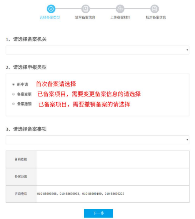 (2)选择申报类型:新申请/备案变更/备案撤销。