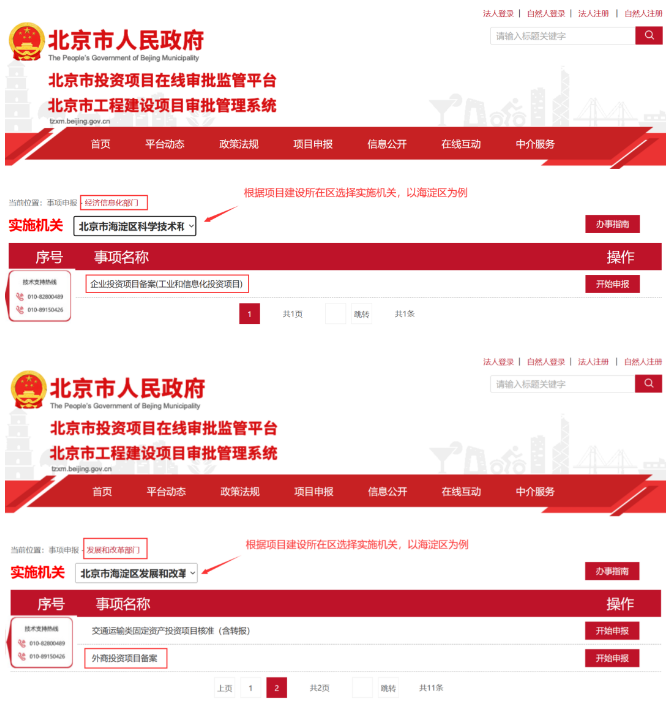 在“事项名称”列找到对应的事项,如“内资企业投资项目备案”、“企业投资项目备案(工业和信息化投资项目)”、“外商投资项目备案”后,点击“开始申报”后跳转到“北京市统一身份认证平台”进行注册,注册后登陆。