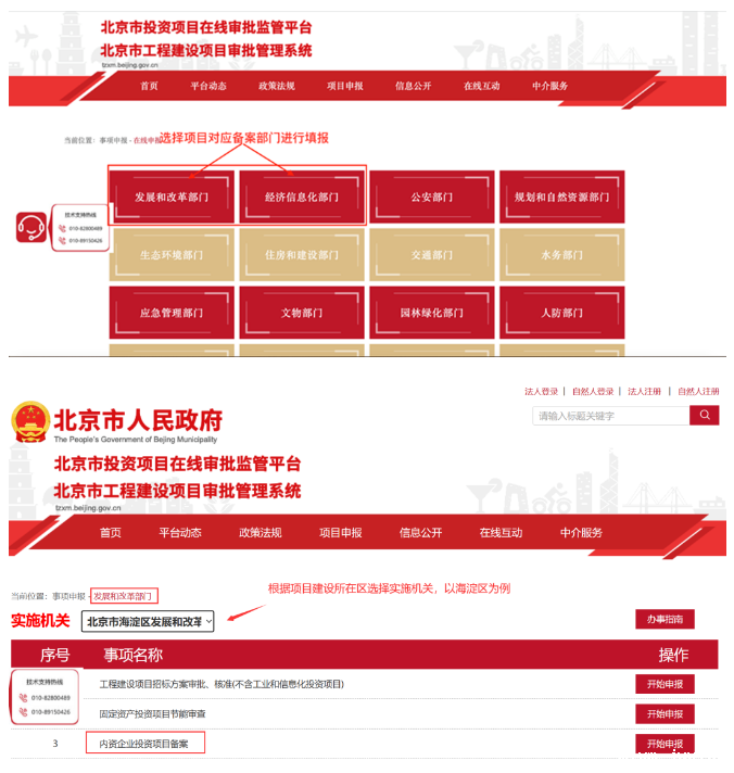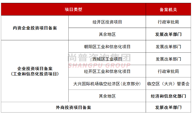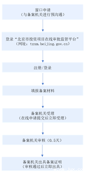 《企业投资项目核准和备案管理办法》(国家发改委2023年1号令)及《关于进一步优化企业投资项目备案管理有关工作的通知》(京发改〔2021〕773号)所称的企业投资项目(以下简称项目),是指企业在中国境内投资建设的固定资产投资项目,包括企业使用自己筹措资金的项目,以及使用自己筹措的资金并申请使用政府投资补助或贷款贴息等的项目。根据项目不同情况,对于企业投资的项目分别实行核准管理或备案管理。项目备案按照属地原则,到建设项目所在地区发展改革部门或经济和信息化部门办理立项备案手续(汽车整车项目除外)。(一)工业用地上符合产业政策及用地规划要求的工业研发类项目由经济和信息化部门负责备案,其他用地上的研发类项目由发展改革部门负责备案。(二)工业用地上依法调整产业结构为文创、商业办公等其他项目,由发展改革部门负责备案。(三)工业项目不可或缺的配套建筑,由经济和信息化部门负责备案。(四)汽车整车和其他投资项目由发展改革部门负责备案,其中汽车整车项目由市发展改革委备案。项目单位应登陆北京市投资项目在线审批监管平台(以下简称“平台”)在线办理项目备案手续,在线办理前,一般需要先与备案机关进行预沟通。涉及国家秘密的项目需联系备案机关线下办理。备案流程为:窗口申请——登录“北京市投资项目在线审批监管平台”——注册/登录——填报备案材料——备案机关受理——备案机关审核——备案机关出具备案证明实践中,“窗口申请”环节一般会就项目投资备案进行预沟通,并对项目备案填报材料及补充材料进行预审,是否准予备案在该环节可得到答复。得到肯定答复后,备案机关会提示企业可以进行线上申请。