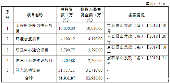 中岩大地拟公开发行股票2429.38万股,募集资金5.19亿元,分别用于工程服务能力提升项目、环境修复项目、研发中心建设项目、信息化系统建设项目以及补充流动资金,其中,31,717.11万元的补充流动资金将可以缓解资金压力。