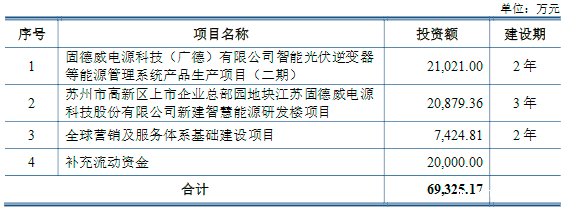 固德威此次拟募集资金6.93亿元,募集资金投向广德固德威智能光伏逆变器等能源管理系统产品生产项目、智慧能源研发楼项目和全球营销及服务体系基础建设项目、补充流动资金等,均围绕公司现有主营业务开展。