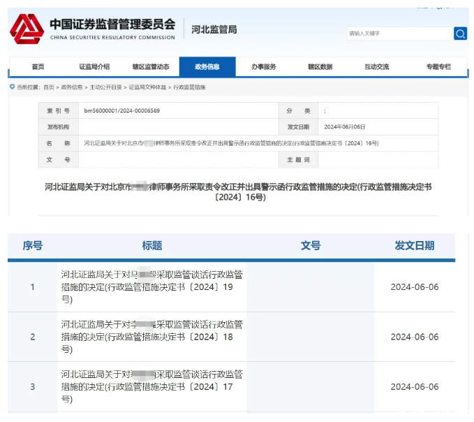 河北证监局依据相关规定,对律师事务所及签字律师采取行政监管措施。