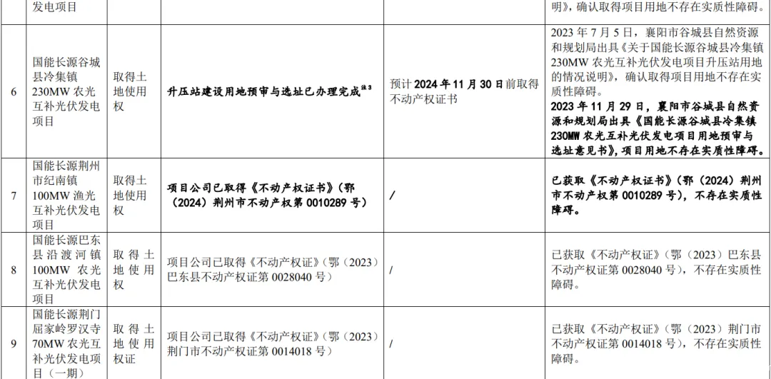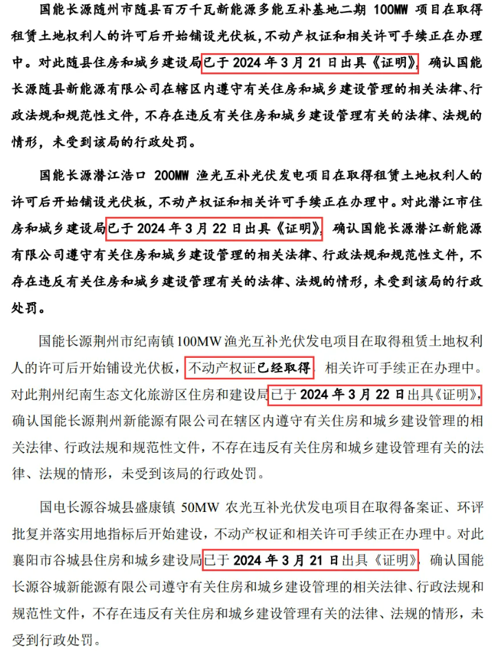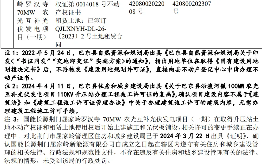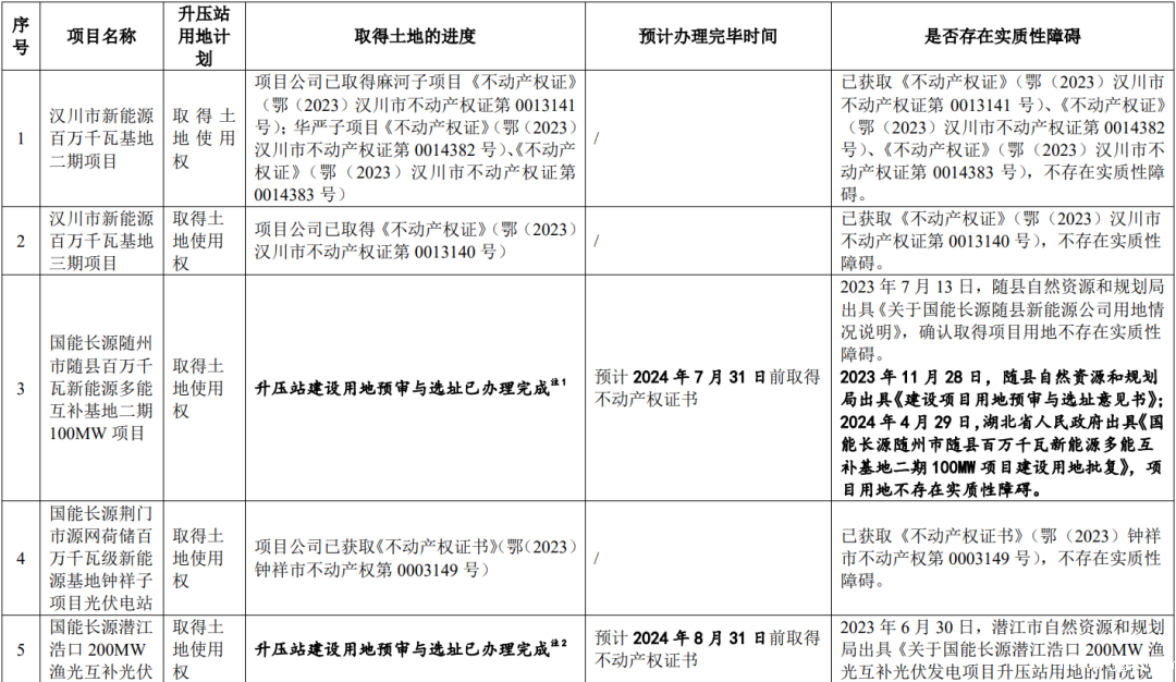 案例一:长源电力(2024-02-01 提交注册 定增)本次发行拟募集资金总额不超过300,000万元,扣除发行费用后的募集资金将投向汉川市新能源百万千瓦基地二期项目等十个募投项目和补充流动资金。募投项目中,部分升压站拟使用的土地尚未取得土地使用权证,就未取得土地权证的项目,当地政府部门出具了证明,但各地证明内容存在一定差异;光伏方阵部分拟通过租赁土地实施。多个募投项目在环评有限期内因投资额发生变更再次申请取得环评。请发行人补充说明:本次募投项目涉及的土地使用是否合法合规,是否存在占用基本农田、违规使用农用地等其他不符合国家土地法律法规政策的情形,募投项目生产经营期限是否与土地租期相匹配;结合尚未取得土地的募投项目的用地落实情况及当地政府出具证明的差异情况,说明取得项目用地是否存在实质性障碍,预计取得时间,若未办理完成是否会对募投项目正常实施产生不利影响及发行人拟采取的有效应对措施。1、本次募投项目涉及的土地使用是否合法合规,是否存在占用基本农田、违规使用农用地等其他不符合国家土地法律法规政策的情形,募投项目生产经营期限是否与土地租期相匹配。本次募投项目的升压站等永久性设施用地,汉川市新能源百万千瓦基地二期项目、汉川市新能源百万千瓦基地三期项目等六个项目已经取得不动产权证。其余四个项目升压站用地不动产权手续正在办理,均已取得了当地政府出具的证明。本次募投项目涉及的永久性用地不存在占用基本农田、违规使用农用地等其他不符合国家土地法律法规政策的情形,取得不动产权的办理程序符合《中华人民共和国土地管理法》等相应法律法规的规定。(2)租赁土地的合法合规情况