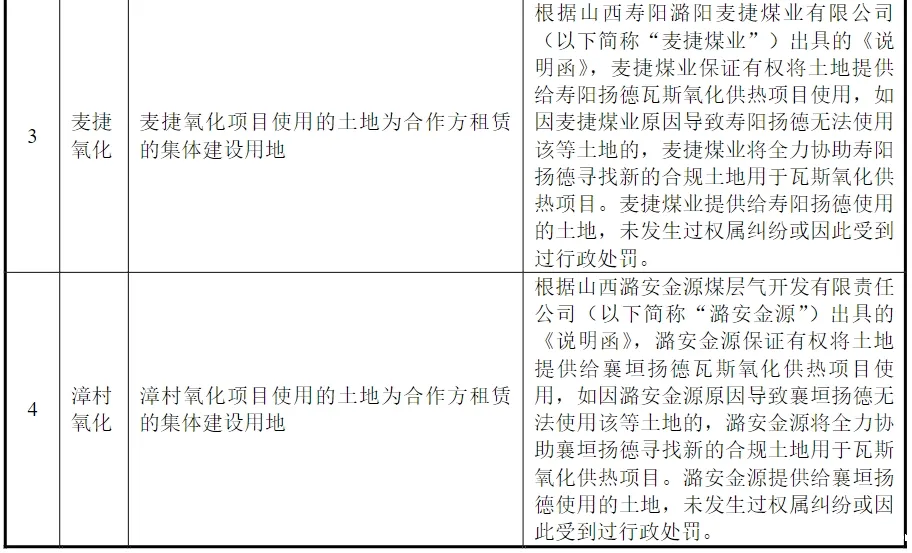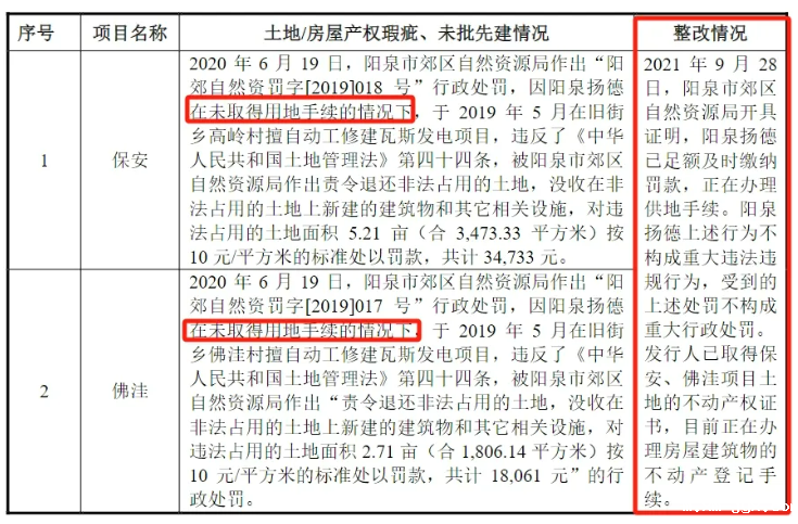 已签订租赁合同的募投项目均为光伏发电项目,其生产经营期均为25年,土地租赁期限及续期安排足以覆盖项目运营期,相关募投项目生产经营期限与租期相匹配。2、结合尚未取得土地的募投项目的用地落实情况及当地政府出具证明的差异情况,说明取得项目用地是否存在实质性障碍,预计取得时间,若未办理完成是否会对募投项目正常实施产生不利影响及发行人拟采取的有效应对措施截至回复出具日,尚未取得土地的募投项目均已取得当地政府出具的证明文件。发行人本次募投项目升压站购买土地取得土地的进度情况、预计办理完毕时间及当地政府出具的证明文件情况如下:因项目开发、用地手续办理进展不一致,募投项目所在当地政府开具的合规证明文件表述有所差异,主要体现在项目开发、用地合法合规的相关表述上,但合规证明文件内容均明确项目公司取得用地不存在实质性障碍,在说明内容上不存在实质性差异。综上,本次募投项目的用地取得不存在实质性障碍。截至回复出具日,就募投项目租赁用地,公司相关控股子公司均已与相关主体签署了土地租赁协议或土地流转协议。就募投项目的升压站等永久性设施用地,汉川市新能源百万千瓦基地二期项目、汉川市新能源百万千瓦基地三期项目等六个项目已经取得不动产权证;其余四个项目,根据当地政府及自然资源和规划局所出具的说明文件,确认相关用地符合土地利用总体规划、符合国家产业政策、土地政策及城乡规划,相关公司依法履行相关程序并支付相关费用后,其取得募投项目永久性设施用地的国有土地使用权证不存在实质性法律障碍,募投项目用地无法办理完成的风险较低。即使未来募投项目用地无法按照计划取得,公司将积极与相关主管部门沟通协调附近其他可用地块作为替代措施,以满足募投项目的用地需求,不会对募投项目正常实施产生不利影响。案例二:扬德环能(2023-10-20 提交注册 IPO)发行人西铭、石港、保安、佛洼瓦斯发电等多个项目涉及租赁村集体土地等情形,多处房屋未取得产权证书。请发行人:分别说明已开展项目中土地、房屋产权瑕疵项目、涉及未批先建项目的基本情况及报告期各期的收入、净利润、总资产占发行人的比例,是否存在被拆除、没收或被行政处罚的风险,是否对持续经营能力存在重大不利影响。1、已开展项目中曾经存在土地、房屋产权瑕疵、涉及未批先建项目的基本情况,是否存在被拆除、没收或被行政处罚的风险,是否对持续经营能力存在重大不利影响。发行人瓦斯发电和瓦斯氧化供热项目需要与煤矿合作,利用煤炭开采过程中产生的煤层气进行发电或供热。由于煤矿低浓度瓦斯不允许远距离输送,发行人低浓度瓦斯发电站需在煤矿瓦斯抽放泵站附近就近选址建设,大多数瓦斯发电项目建设用地属于地理位置偏远、交通不便的山地或荒地等,项目建设用地手续办理程序相对复杂,耗时较长,因此发行人已投产项目存在土地、房屋产权瑕疵及未批先建的情况。针对前述情况,发行人在确保公司项目顺利开展的情况下,积极办理相关用地和建设手续,截至2021年12月31日,发行人部分项目已经对曾经存在的土地、房产瑕疵和未批先建情况进行了整改,并取得了土地和房产的权属证书,具体情况如下:如上表所示,发行人上述11个项目曾经存在的土地、房产瑕疵及未批先建情况已经整改完毕,并取得了相关土地和房产的权属证书,不存在被拆除、没收或被行政处罚的风险,对持续经营能力不存在重大不利影响。