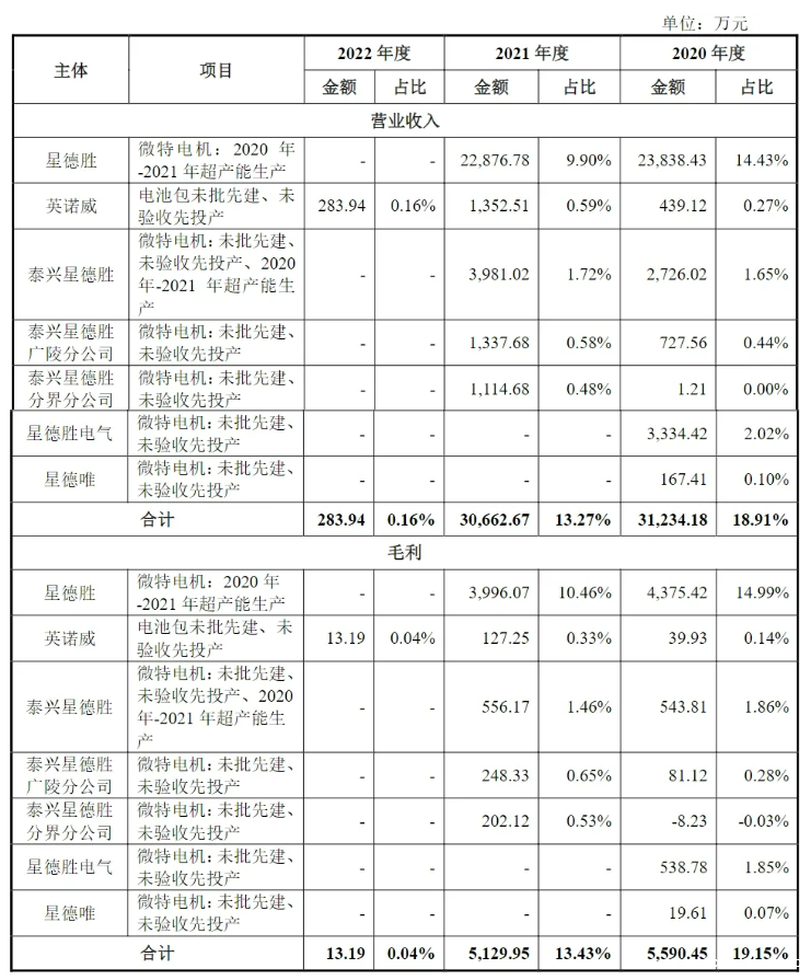 报告期内,发行人未批先建、未办理环保设施竣工验收先进行生产、超出环评批复产能生产相关主体及项目对应的营业收入、毛利及其占比情况具体如下:由上表可知,报告期内,发行人未批先建、未办理环保设施竣工验收先进行生产、超出环评批复产能生产相关主体及项目所产生的营业收入、毛利及其占比逐年下降,且并非发行人报告期内营业收入、利润的主要来源。发行人IPO申报前,已就上述情形完成整改。3、相关违规行为违反的具体法律法规,上述出具证明文件的机关是否为有权机关。