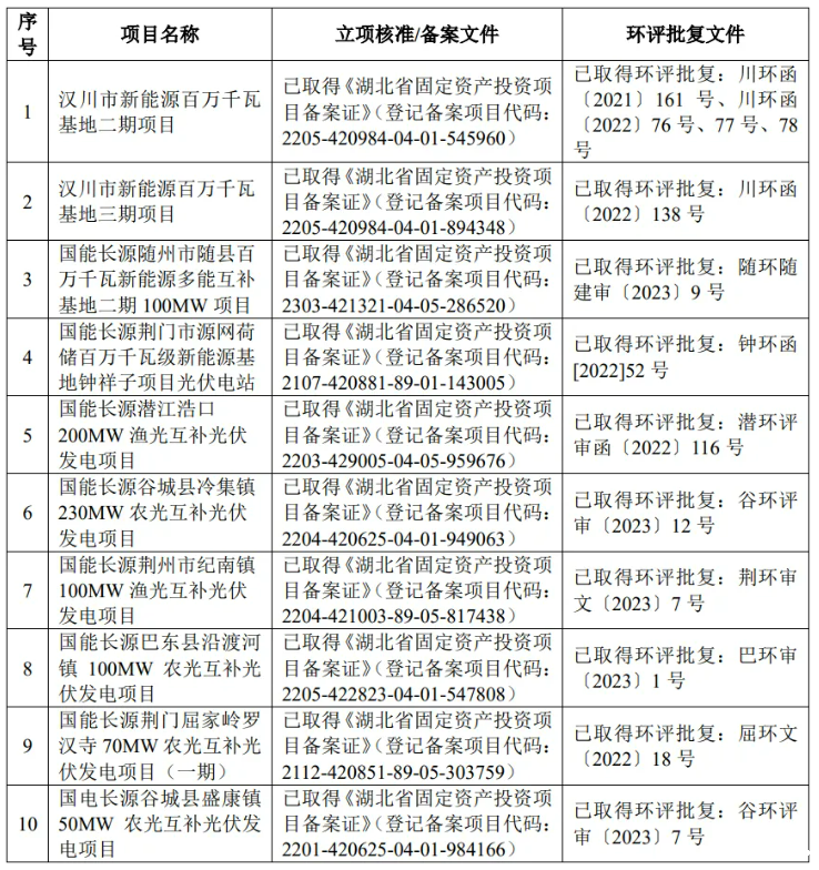 本次募投项目中汉川市新能源百万千瓦基地二期项目、汉川市新能源百万千瓦基地三期项目等八个项目因投资额变动办理多次环评,主要原因系上述项目编制项目环评报告时,投资额为初步估算投资,后公司投资决策明确投资额后,按实际投资额进行变更。项目开展过程中投资额持续优化完善,项目公司依规办理相应的环评变更手续,该情形下的变更属于行业惯例。此外,国能长源巴东县沿渡河镇100MW农光互补光伏发电项目和国能长源荆门屈家岭罗汉寺70MW农光互补光伏发电项目(一期)同步办理了建设单位变更,主要原因系发行人在项目实施主体尚未成立前通过已成立主体先行办理项目征地等相关流程,等项目实施主体成立后再行办理建设单位变更相关手续。