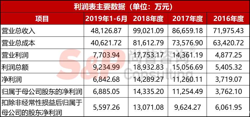 2016年至2019年1-6月,中饮股份营业收入分别为71,975.43万元、86,659.18万元、99,021.09万元和48,126.87万元;扣非后归母净利分别为6,061.95万元、9,624.27万元、13,071.08万元和5,597.26万元,盈利能力较好。