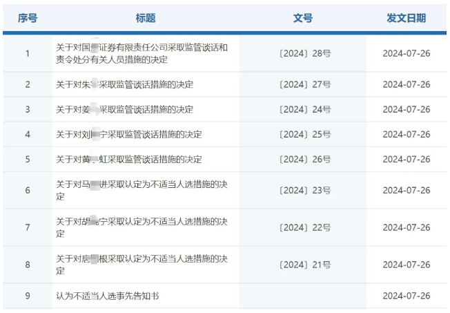 7月26日,国*证券及其高管,收到江西证监局9张罚单。公告显示,公司存在接管前未按规定如实报告股东实际持股比例,董事会、经理层人员超出授权履职,股票质押业务内控不完善和为股东的关联方提供融资,核心业务人员违反廉洁从业规定,授权未取得高管任职资格人员实际履行高管职务等情况。