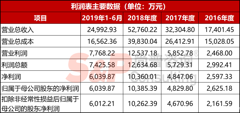 2016年至2019年1-6月,博迁新材营业收入分别为1.74亿元、3.23亿元、5.28亿元和2.50亿元;同期,扣非后归属于母公司股东的净利润分别为2162万元、4671万元、10262万元和6012万元。