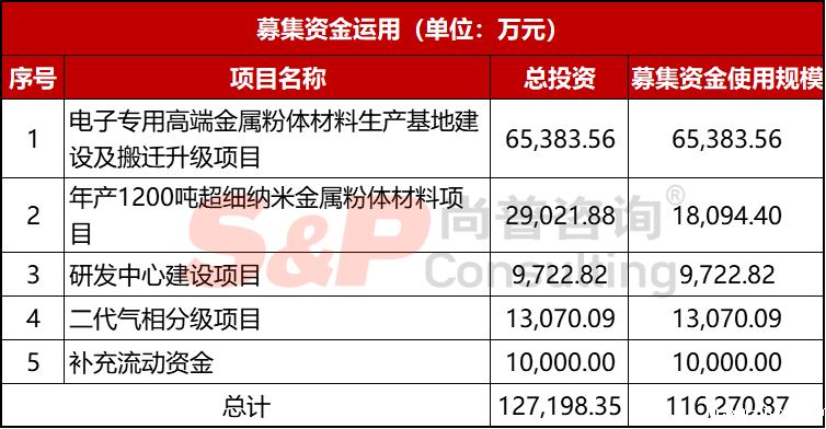 博迁新材本次拟公开发行股票不超过6,540.00万股,占发行后总股本的比例不低于25%,本次募集资金投入11.63亿元,主要用于电子专用高端金属粉体材料生产基地建设及搬迁升级项目、年产1200吨超细纳米金属粉体材料项目、研发中心建设项目、二代气相分级项目、补充流动资金。