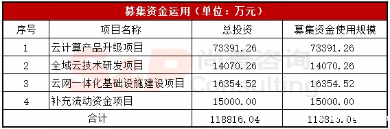 青云科技本次拟公开发行不超过1200万股,占发行后总股本的比例不低于25%。预计募集资金11.88亿元,主要用于云计算产品升级项目、全域云技术研发项目、云网一体化基础设施建设项目、补充流动资金项目。