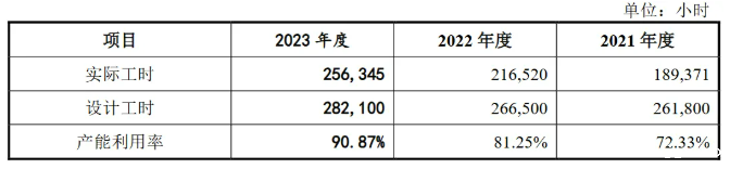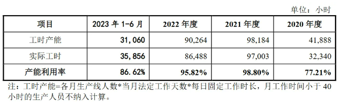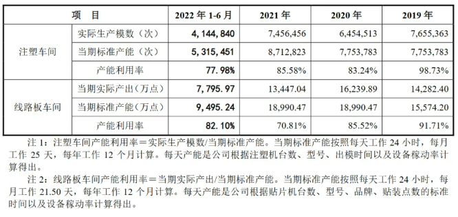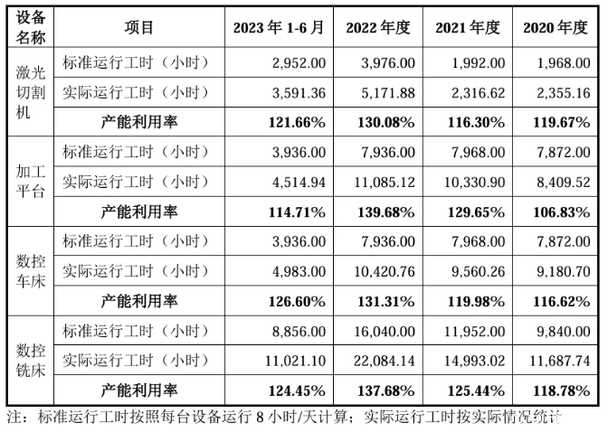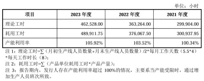 通用公式:产能利用率=实际产量/设计产能*100%实际产量通常为有企业生产统计的既定数据,少有争议,因此,产能利用率计算的关键在于设计产能的合理准确核算。注:实际产量即企业当期实际产量;设计产能即在原料、燃料、人工等得以保证的情况下,生产设备等生产资源保持正常运行可实现并长期维持的总产量。制造类企业的产能核算通常需根据实际的产品生产工序找到制约产能的关键因素,之后对影响瓶颈工序产能的生产资源要素(厂房、设备、人员、材料等)进行分析。以实际案例来看,主要影响要素通常以生产人员、生产设备为主,具体因企业生产资源现状而异。【生产人员工时核算法】:如该瓶颈工序产能的释放受限于生产人员数量,则影响其产能的生产资源要素为生产人员,产品产能多通过理论年度生产人员工时来反映。理论年度生产人员工时=Σ(月初生产线人员数量+月末生产线人员数量)/2*每月法定工作天数*每天工作时长;或=Σ(当月参与生产人员数量*当月工作天数*每天工作小时数);或=定额工时*计划产量;若需进一步折算产品产能,可选取某一产品作为标准产品,以标准产品的单位耗用工时作为标准单位耗用工时,对理论产品产能进行核算。【关键设备产能核算法】:如该瓶颈工序产能的释放受限于设备数量,则影响其产能的生产资源要素为设备,产品产能多通过理论年度设备产能情况来反映。理论年度设备产能=瓶颈工序生产设备数量*单台设备标准小时产能*日标准工作小时数*年工作天数;如各类产品分产线生产,则各产线瓶颈工序设备产能即可对应各类产品产能,案例如威胜信息;如实际生产模式为柔性生产,各类产品对瓶颈工序设备是按订单排期使用,则该工序设备产能利用情况仅用来反映整体产能利用率,不对应各类产品产能,案例如未来电器。公司深耕于塑料机械配套件行业,主要从事塑料成型设备核心零部件研发、生产和销售,主要产品为塑料成型设备的螺杆、机筒、哥林柱及相关配件,主要应用于注塑机、挤出机等塑料成型设备。公司主要产品均为非标准化定制类产品,产品规格不一,生产过程主要涉及金属材料机械加工、热处理和电镀铬等生产工艺。产品根据客户对外形尺寸、结构、性能指标、搭载技术等要求,所需的加工工序、生产时间、耗费人力等各不相同。因此,以设备台数为产能统计标准不能准确反映公司生产能力,而根据公司生产一线员工的工时数为标准反映公司产能利用率相对更为客观、准确。公司专业从事电网安全控制设备、电能质量优化治理设备的研发、生产及销售,是国内知名的电力设备供应商,主要产品包括电网安全控制设备和电能质量优化治理设备两大类。公司产品按照客户需求定制化生产,产品规格、型号、性能、品类较多,同时受限于生产设备、场地、人员等各因素影响,公司的生产线与传统的标准化、专用化生产线差别较大,亦不存在传统意义上的“产能”概念。因此,结合公司的具体生产工序(绕线和浇注为瓶颈工序),公司的产能按照生产车间人员产品工时数为标准更能客观准确地反映公司产品的生产能力。报告期各期,公司产能、产量、产能利用率的具体情况如下:公司是一家致力于电力系统相关智能产品技术研发与产业化的高新技术企业,基于在智能电网领域积累的电网监测技术和电气系统设计及集成化能力,形成了电网智能监测和新能源两大业务板块,主要产品故障录波监测装置、输电线路故障监测装置、时间同步装置处于细分行业领先地位。公司产品类别、规格和型号较多,普遍具有非标准化、定制化特征,即使是同类产品,也因客户需求不同而在工艺设计、核心单元组装、机柜装配等方面存在较大差异;另一方面,不同规格型号产品可共用生产设备进行制造。因此,以产品数量作为产能统计标准无法直观反映公司的产能情况。不同产品生产周期及人员的占用情况存在较大差异,公司可通过人力的调配和优化来提高总体生产效率并满足各类业务订单需求,各类产品的产能可根据实际订单情况适时调整;核心生产人员的理论工时构成公司的产能上限。根据公司的生产模式,在现有生产场所下,板卡测试、主机组装、程序烧录以及整机调试等核心工序是制约产能的关键因素,因此以直接参与生产的人员工时数为标准能更为客观准确地反映公司产品的生产能力。公司从事电力物联网感知层终端及成套设备的研发、设计、生产和销售,主要产品包括DTU、FTU、台区智能融合终端、故障指示器、一二次融合成套柱上断路器、一二次融合成套环网箱和其他低压电气设备等。公司产能主要取决于生产场地、检测设备和生产人员,在设备及场地相对充足的情况下,主要产能限制取决于生产人员数量。且因部分设备可以应用于不同产品生产,如果以设备数量计算产品产能,无法真实反映公司生产能力。所以公司产能以生产人员工时为计算口径较为准确。公司是一家专业从事薄膜电容器制造设备研发、生产和销售的高新技术企业,致力于为薄膜电容器生产商提供高效、稳定的智能设备和解决方案。公司的产品包括薄膜电容器卷绕机、金属薄膜镀膜机及电容器薄膜分切机,此外还提供相关设备配件销售以及金属薄膜镀膜加工业务。公司生产的薄膜电容器设备具有定制化特点,不同产品在生产工艺、生产时间、