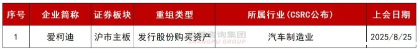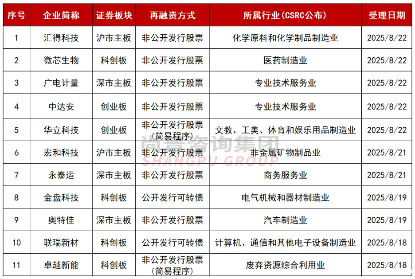 IPO市场 (一)纳百川新能源股份有限公司 公司专注从事新能源汽车动力电池热管理、燃油汽车动力系统热管理及储能电池热管理相关产品的研发、生产和销售,主要产品包括电池液冷板、电池集成箱体、燃油汽车发动机散热器、加热器暖风等。 主要财务数据及财务指标 募集资金运用 (二)厦门恒坤新材料科技股份有限公司 公司致力于集成电路领域关键材料的研发与产业化应用,是中国境内少数具备12英寸集成电路晶圆制造关键材料研发和量产能力的创新企业之一,主要从事光刻材料和前驱体材料的研发、生产和销售。 公司客户涵盖了多家中国境内领先的12英寸集成电路晶圆厂,已实现境外同类产品替代,打破集成电路关键材料国外垄断。 值得一提的是,7月25日,恒坤新材科创板IPO遭暂缓,成为年内首家上会被暂缓审议的IPO企业,时隔一月公司再度上会。 (三)西安泰金新能科技股份有限公司 公司主要从事高端绿色电解成套装备、钛电极以及金属玻璃封接制品的研发、设计、生产及销售,是国际上可提供高性能电子电路铜箔和极薄锂电铜箔生产线整体解决方案的龙头企业,是国内贵金属钛电极复合材料及电子封接玻璃材料的主要研发生产基地。 公司产品终端应用于大型计算机、5G高频通信、消费电子、新能源汽车、绿色环保、铝箔化成、湿法冶金、氢能、航天军工等领域。 主要财务数据及财务指标 募集资金运用 (四)江苏省精创电气股份有限公司 公司主营业务为冷链设备智能控制器、医药与食品冷链监测记录仪、制冷热泵检测仪表及环境颗粒物检测仪器等产品的研发、生产和销售,并提供物联网和基于云的系统解决方案。 公司提供的产品和服务主要包括冷链设备智能控制器、节能电控箱、工业冷水机控制器;物联网记录仪、数字温度标签;红外检漏仪、智能歧管仪、智能真空泵等产品以及物联网、云计算等服务。公司产品及服务主要应用于制冷暖通(HVAC/R)、医药、食品和环境检测等行业或领域。 主要财务数据及财务指标 募集资金运用 再融资 三、下周上会预告 下周无上市公司再融资上会审核。 并购重组