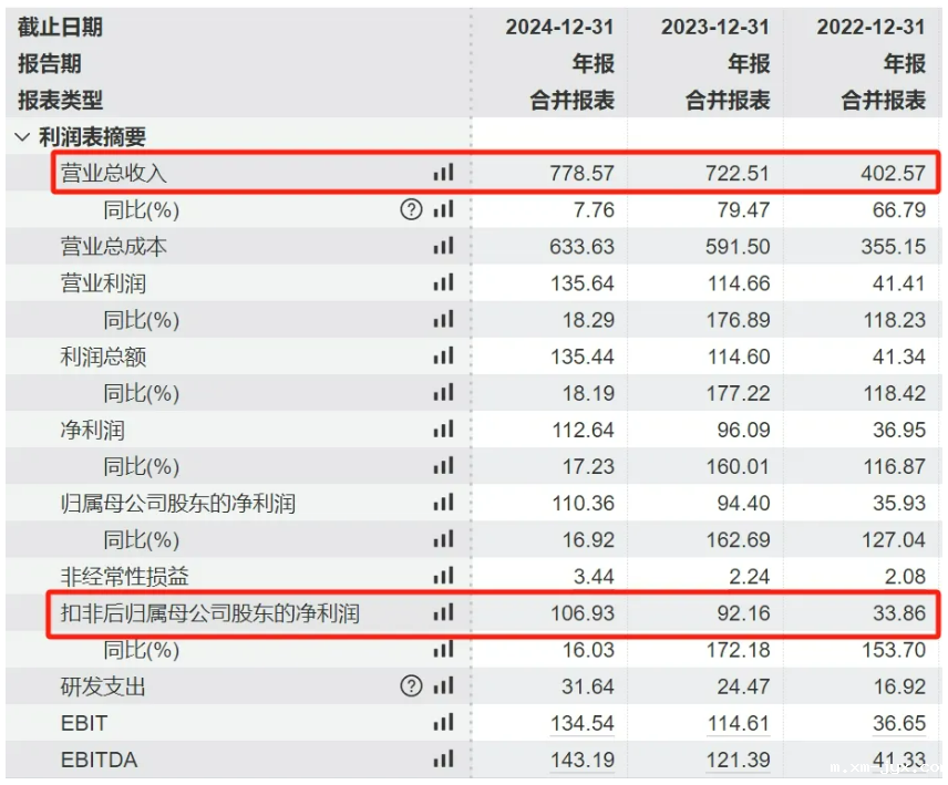财务数据显示,2022年至2024年,阳光电源分别实现营业收入402.57亿元、722.51亿元及778.57亿元;扣非后归母净利润分别为33.86亿元、92.16亿元及106.93亿元。