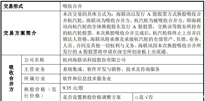 海联讯向杭汽轮全体换股股东发行A股股票,并以此为对价通过换股方式吸收合并杭汽轮,杭汽轮届时的全体换股股东持有的股份将按照换股比例转换为海联讯的A股股份。本次吸收合并的交易对价以双方定价基准日前20个交易日股票均价为基础确定。海联讯换股价为9.35元/股,杭汽轮B换股价经溢价34.46%后亦为9.35元/股,换股比例为1:1。