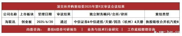9月11日,深交所并购重组审核委员会召开2025年第9次审议会议,海联讯吸收合并杭汽轮B申请获审核通过。