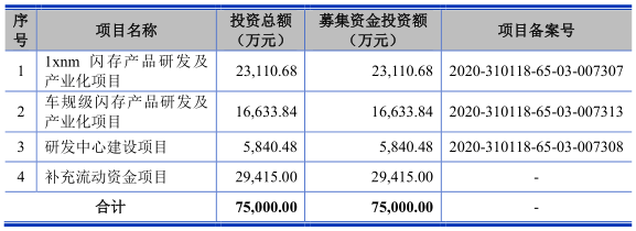 本次发行拟募集资金7.5亿元,其中2.31亿元用于1xnm 闪存产品研发及产业化项目,1.66亿元用于车规级闪存产品研发及产业化项目、5,840.48万元用于研发中心建设项目,2.94亿元用于补充流动资金项目。