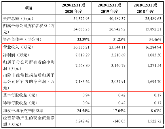 2018年至2020年,和达科技营业收入分别为:1.63亿元、2.35亿元、3.63亿元,同期,扣非后归属于母公司股东的净利润分别为:1,694.7万元、3,037.91万元、7,183.62万元。