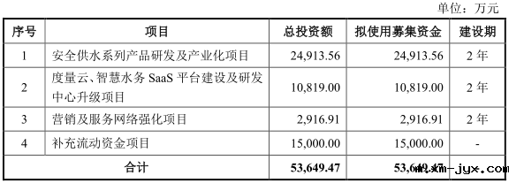 本次发行拟募集资金5.36亿元,其中2.49亿元用于安全供水系列产品研发及产业化项目,1.08亿元用于度量云、智慧水务SaaS平台建设及研发中心升级项目,2,916.91万元用于营销及服务网络强化项目,1.5亿元用于补充流动资金项目。
