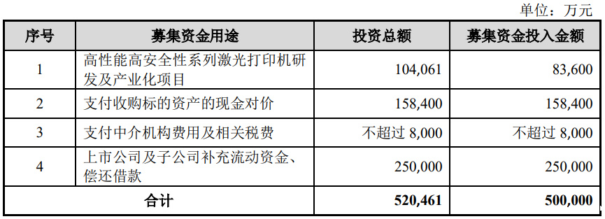 本次募集配套资金将用于标的公司奔图电子高性能高安全性系列激光打印机研发及产业化项目、支付收购标的资产的现金对价、支付中介机构费用及相关税费、上市公司及子公司补充流动资金、偿还借款。